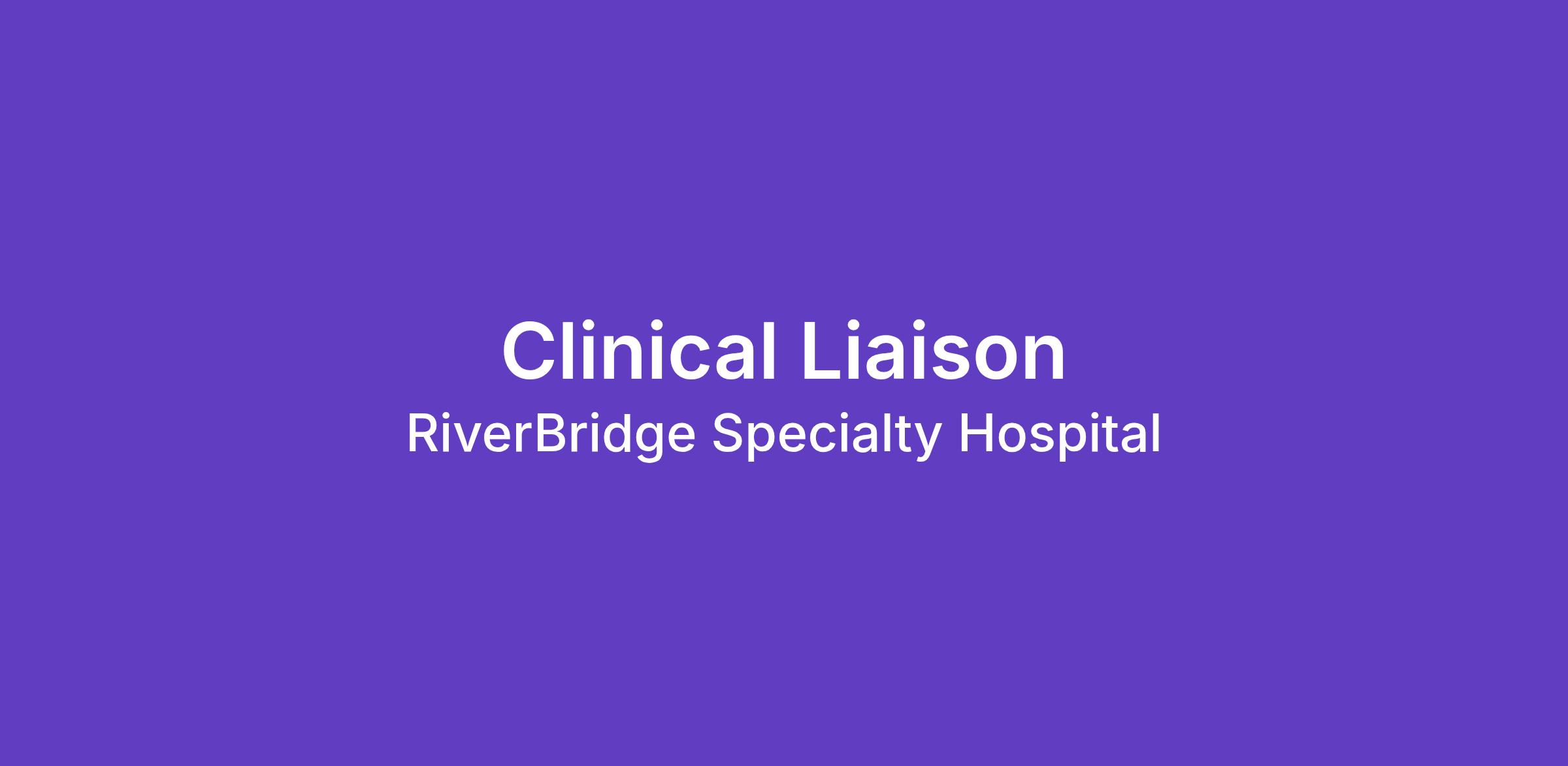 POSITION SUMMARY: The Clinical Liaison is responsible for educating medical and business professionals, community resources, and others within the service area of the programs and services RiverBridge Specialty Hospital can provide. He/She is also responsible for achieving financial and strategic goals for assigned territory by establishing and maintaining customer relationships. He/She is actively involved in business development by one-to-one contact and professional education.