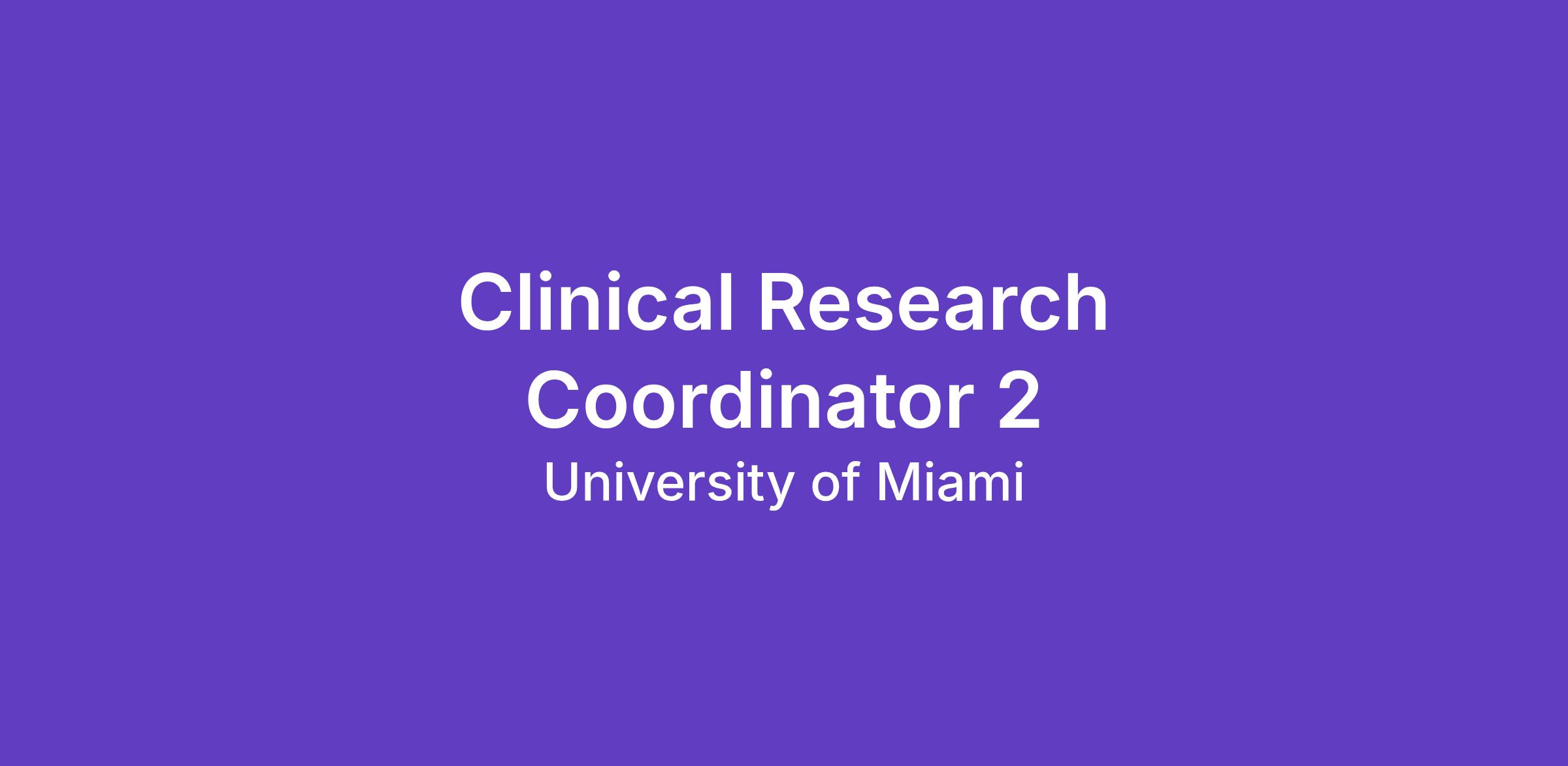 The Miami Transplant Institute is currently seeking a Full-Time Clinical Research Coordinator 2 to work onsite in Miami. The Clinical Research Coordinator 2 serves as a mid-level clinical research professional that assists in the planning, coordinating, implementing, monitoring, and evaluating of specific clinical research studies. This role assists in the day-to-day operations of clinical research protocol implementation and carries out study coordination duties from protocol initiation to study close-out according to regulatory/sponsor guidelines. The incumbent works closely with study team members and other staff/faculty/study sites to ensure study participant safety and adherence to approved protocols, help with study-related administrative tasks, facilitate across-the-board flow of information, and coordinate study activities and personnel.