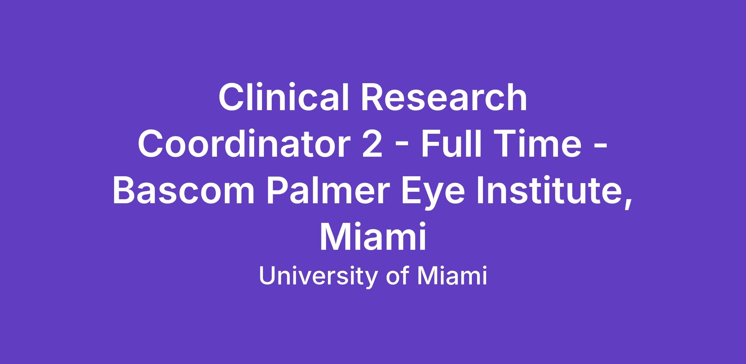 The University of Miami, Bascom Palmer Eye Institute, has an exciting full time job opportunity for a Clinical Research Coordinator 2 in Miami, Florida.
