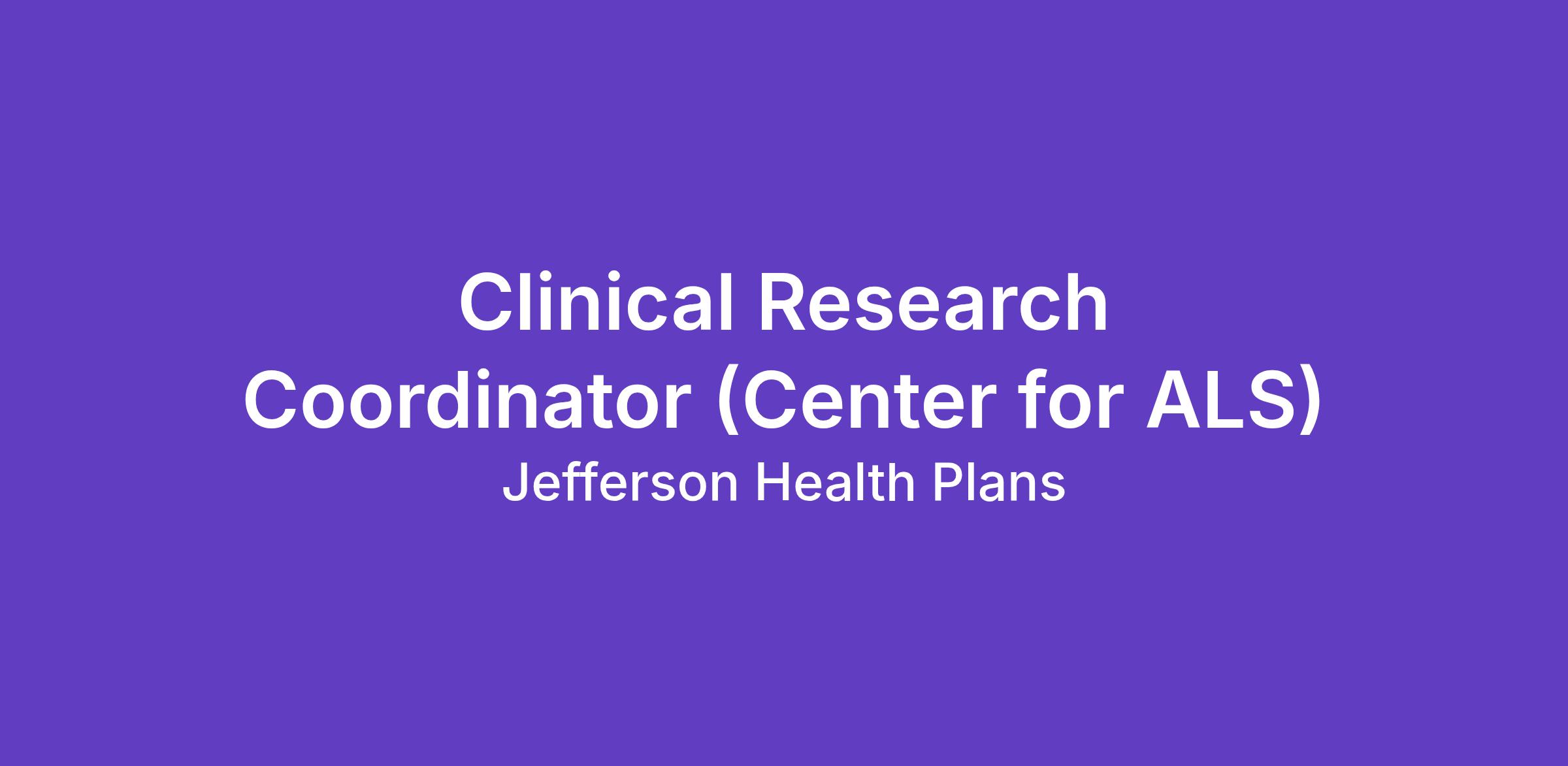 The Jefferson Weinberg ALS Center at the Vickie & Jack Farber Institute for Neuroscience, Thomas Jefferson University & Jefferson Health, seeks an experienced Clinical Research Coordinator.