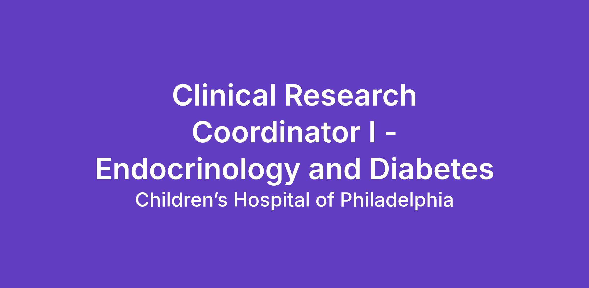 Seeking Breakthrough Makers Children’s Hospital of Philadelphia (CHOP) offers countless ways to change lives. Our diverse community of more than 20,000 Breakthrough Makers will inspire you to pursue passions, develop expertise, and drive innovation. At CHOP, your experience is valued; your voice is heard; and your contributions make a difference for patients and families. Join us as we build on our promise to advance pediatric care—and your career. CHOP does not discriminate on the basis of race, color, sex, national origin, religion, or any other legally protected categories in any employment, training, or vendor decisions or programs. CHOP recognizes the critical importance of a workforce rich in varied backgrounds and experiences and engages in ongoing efforts to achieve that through equally varied and non-discriminatory means. A Brief Overview The Clinical Research Coordinator I (CRC I) will work with Steve Willi, MD, Director of the Diabetes Center and his team. Dr. Willi’s research focuses on the treatment and delay of progression type 1 and type 2 diabetes in children. Under the direction of Dr. Willi and other team members the CRC I provides support in the conduct of research. What you will do