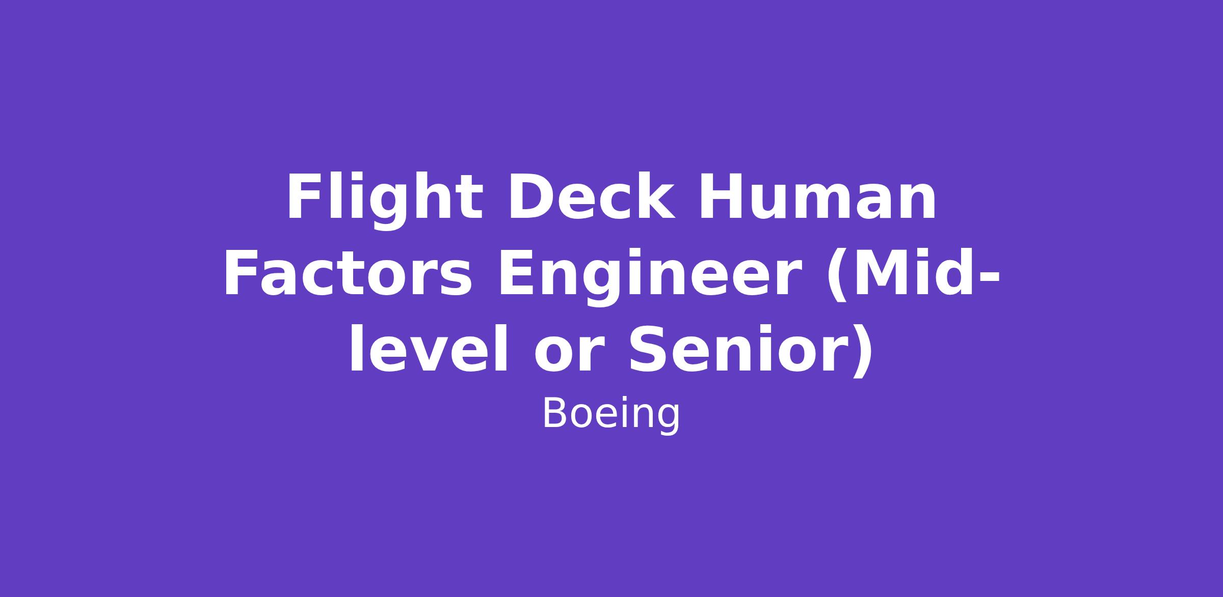 The Boeing CompanyBoeing Commercial Airplanes (BCA) is looking for a Flight Deck Human Factors Engineer (Mid-level or Senior) at our North Charleston, South Carolina site.