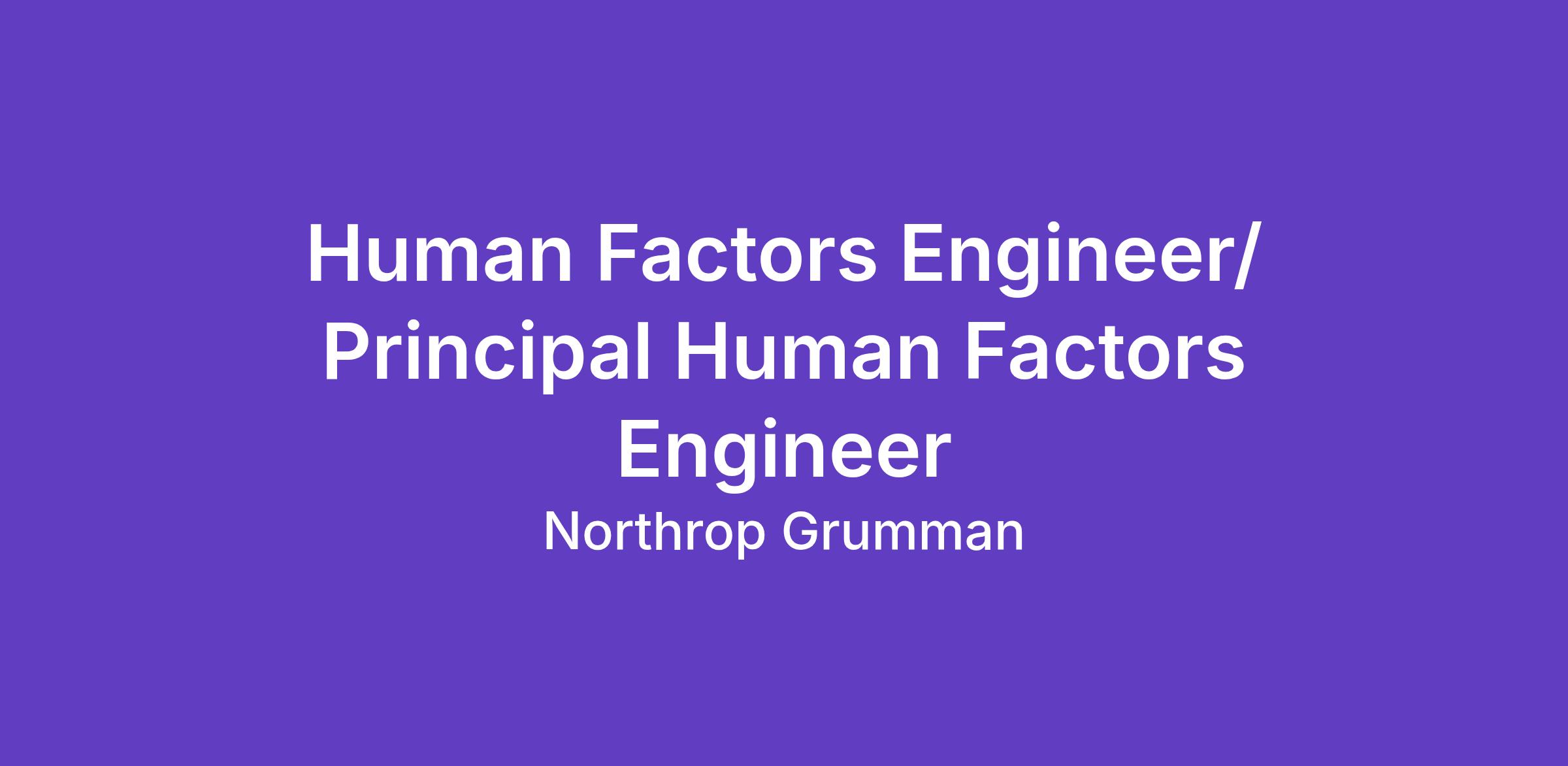 Northrop Grumman Aeronautics Systems has an opening for a Human Factors Engineer/ Principal Human Factors Engineer to join our team of qualified, diverse individuals. Position is located in Melbourne, Florida.