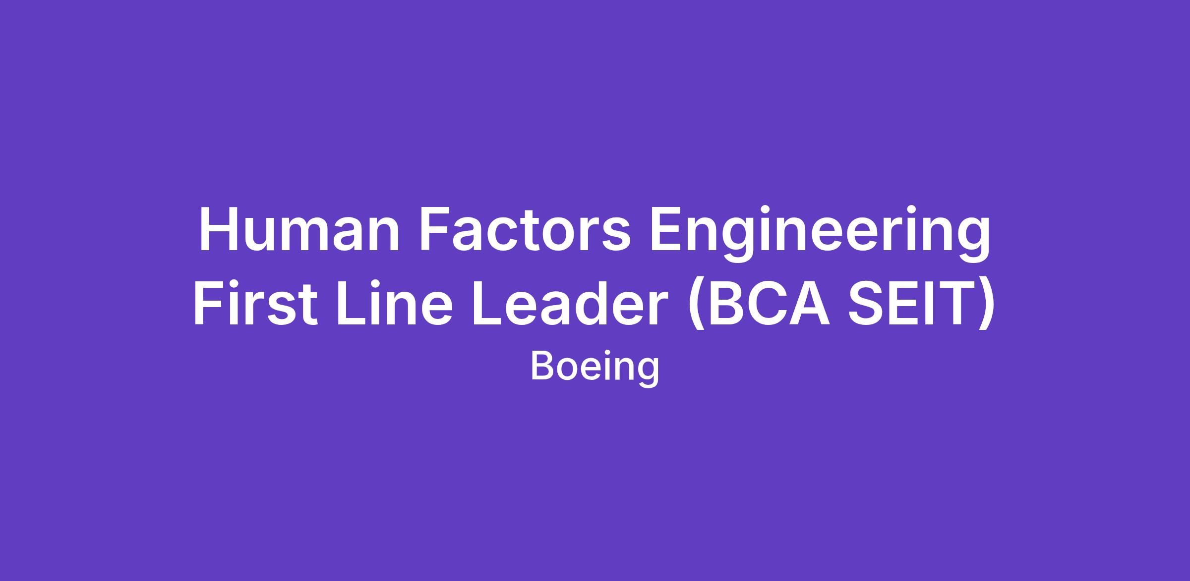 The Boeing CompanyThe Boeing Commercial Airplanes, Systems Engineering & Integration Team (SEIT) is seeking a highly talented Human Factors Engineering First Line Leader to lead the team located in Everett, WA.