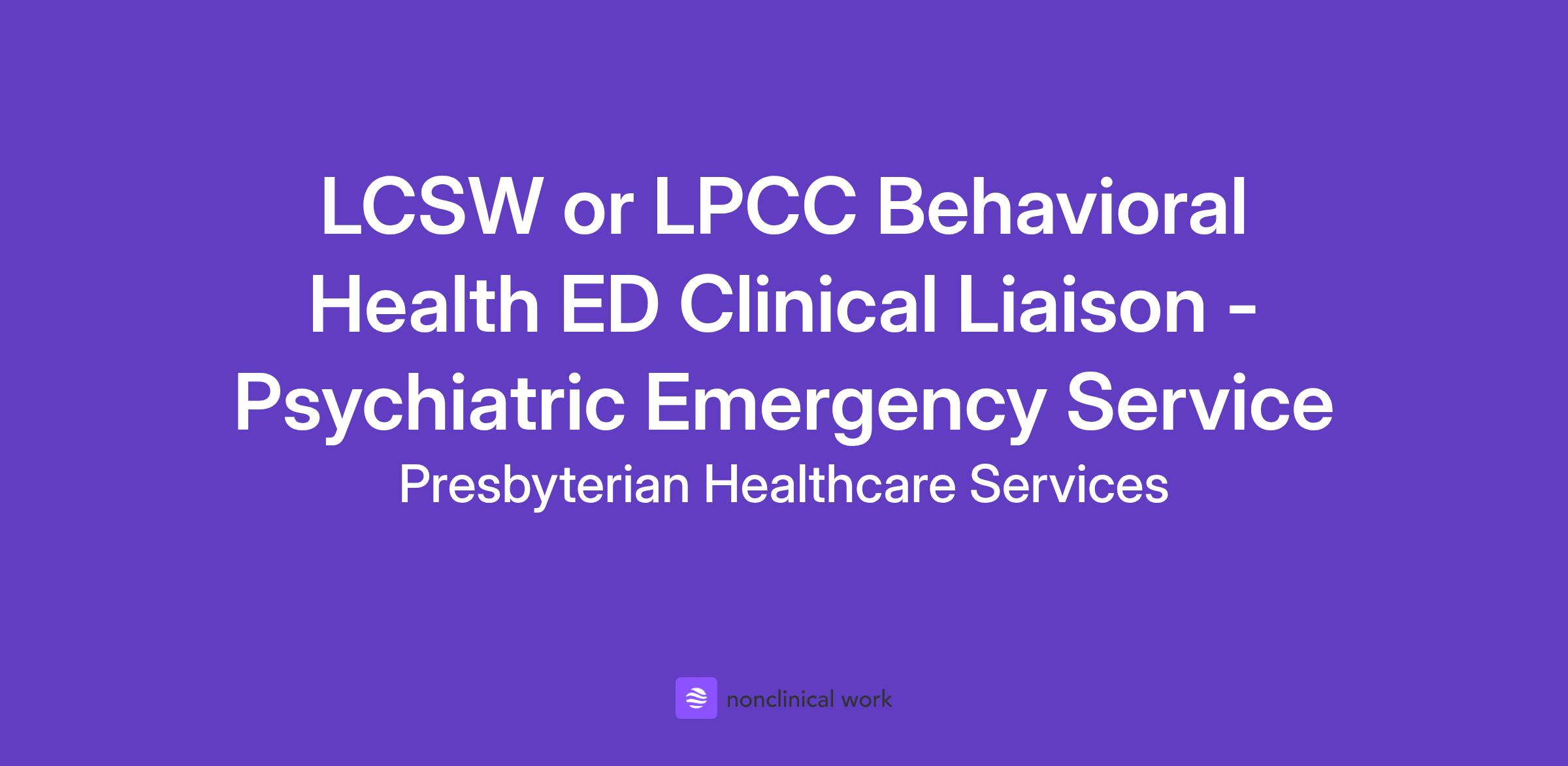 Presbyterian Medical Group seeks an LCSW or LPCC Behavioral Health Emergency Department Clinicial Liaison to join our established Psychiatry Emergency Services Team in Albuquerque, New Mexico.