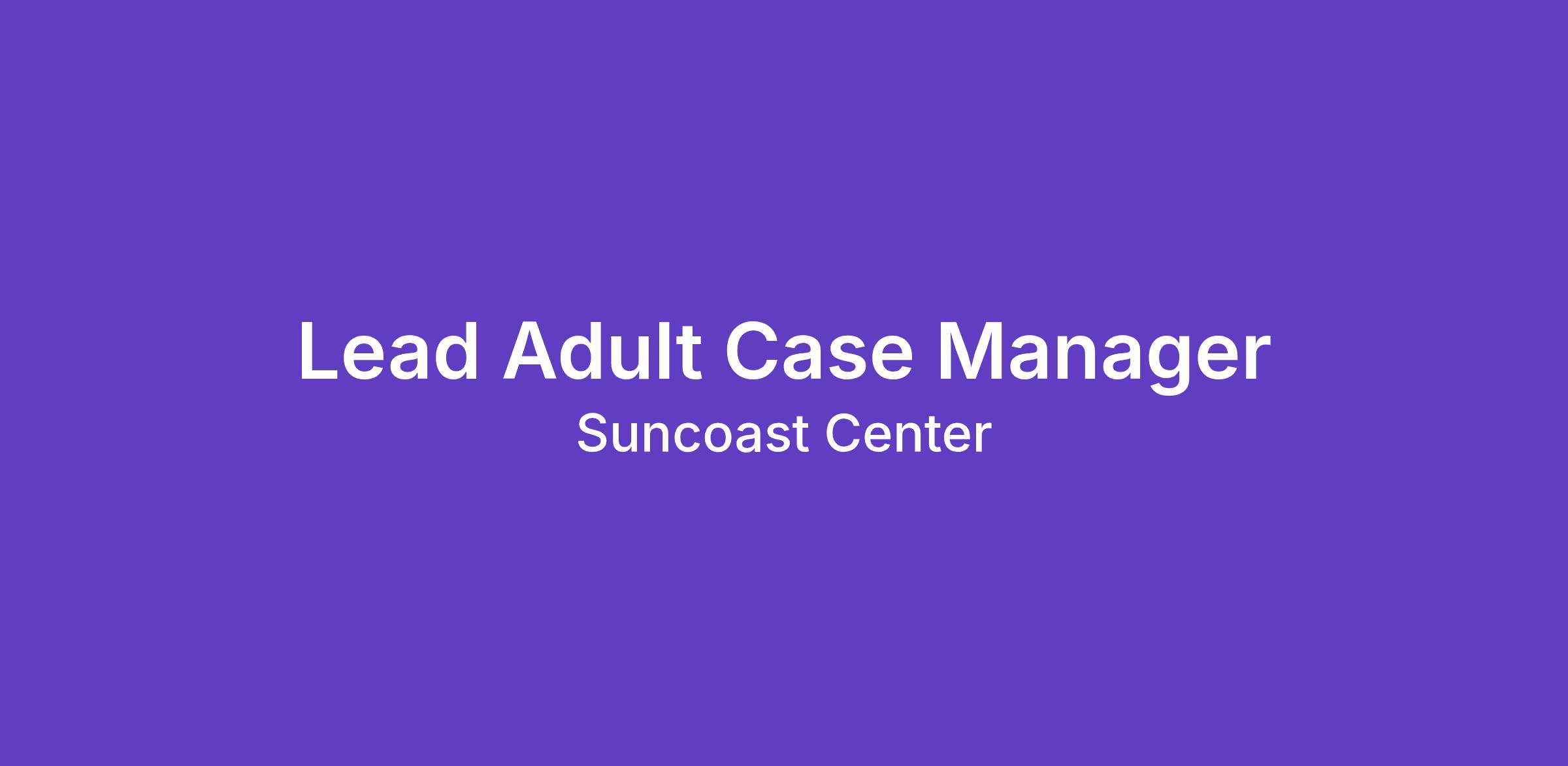 Suncoast Center, a leader in quality behavioral health services, is seeking a Lead Adult Case Manager to join our team. The position requires strong organizational skills, professionalism, and the ability to work in a fast-paced, client-centered environment.