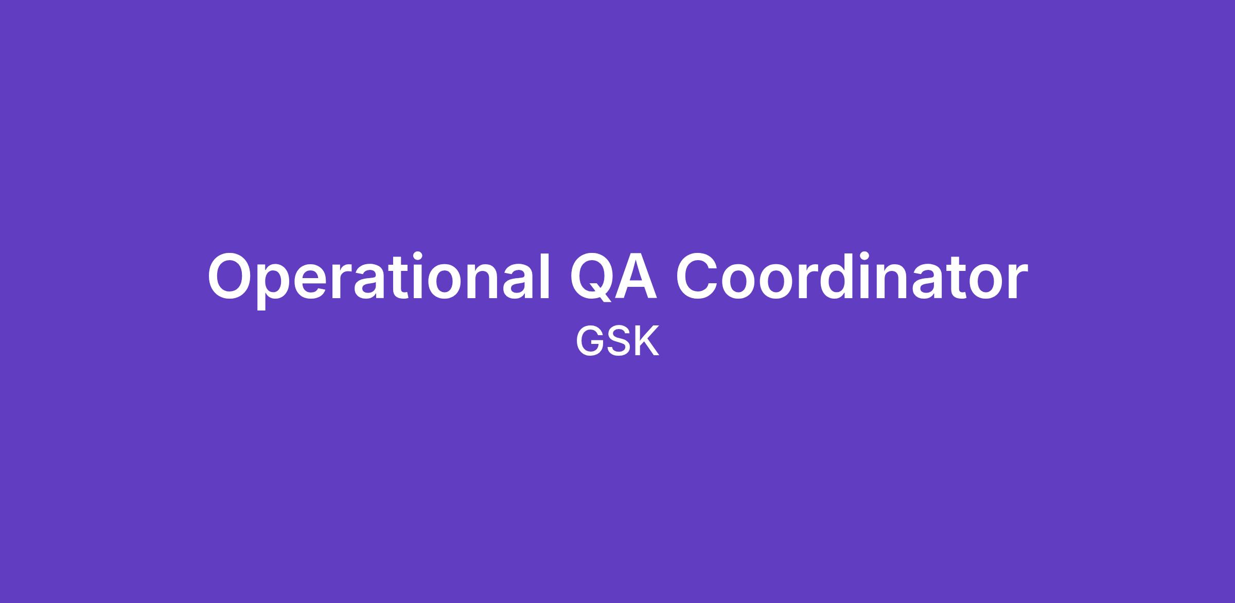 The Operational QA Coordinator will provide operational quality support to the site for new and existing products, review records to ensure compliance with local and regulatory guidelines, and to execute Quality Systems actions. These actions are executed through direct intervention between this role and other staff in the facility. This role may develop, implement, and administer input and in-process electronic quality systems for the production of biopharmaceutical products, ensuring compliance with GSK internal procedures, policies, standards, and worldwide regulatory expectations. This role provides quality decisions to project teams and to production operating teams.