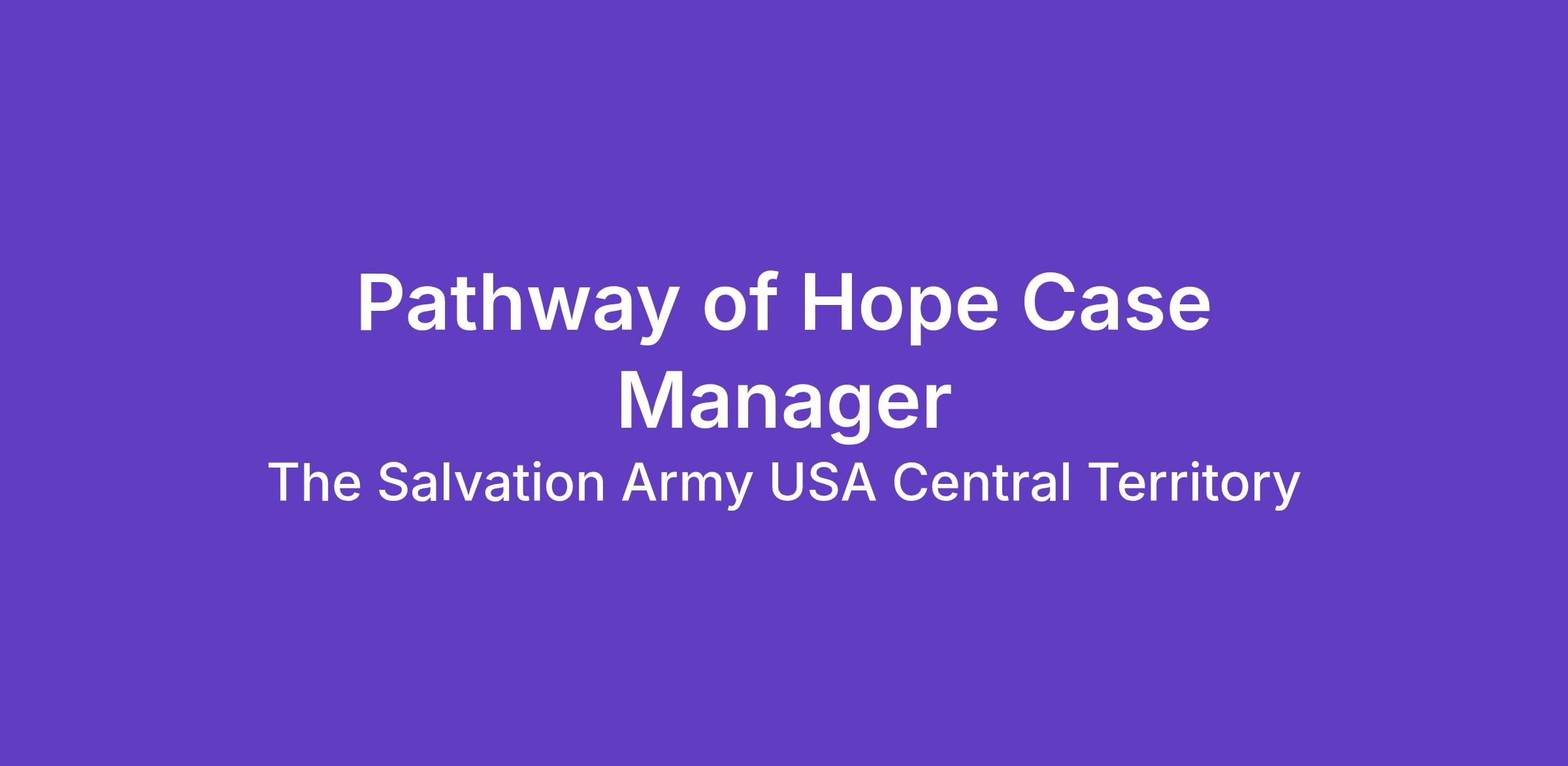The Pathway of Hope Case Manager is responsible for managing Pathway of Hope casework services to families at the Midwest Corps. The Case Manager works under the guidance of the Regional Social Work Manager along with the Corps Officer implementing the program’s objectives, that is, providing services to Pathway of Hope families, keeping required records, and identifying resources to support participating families.