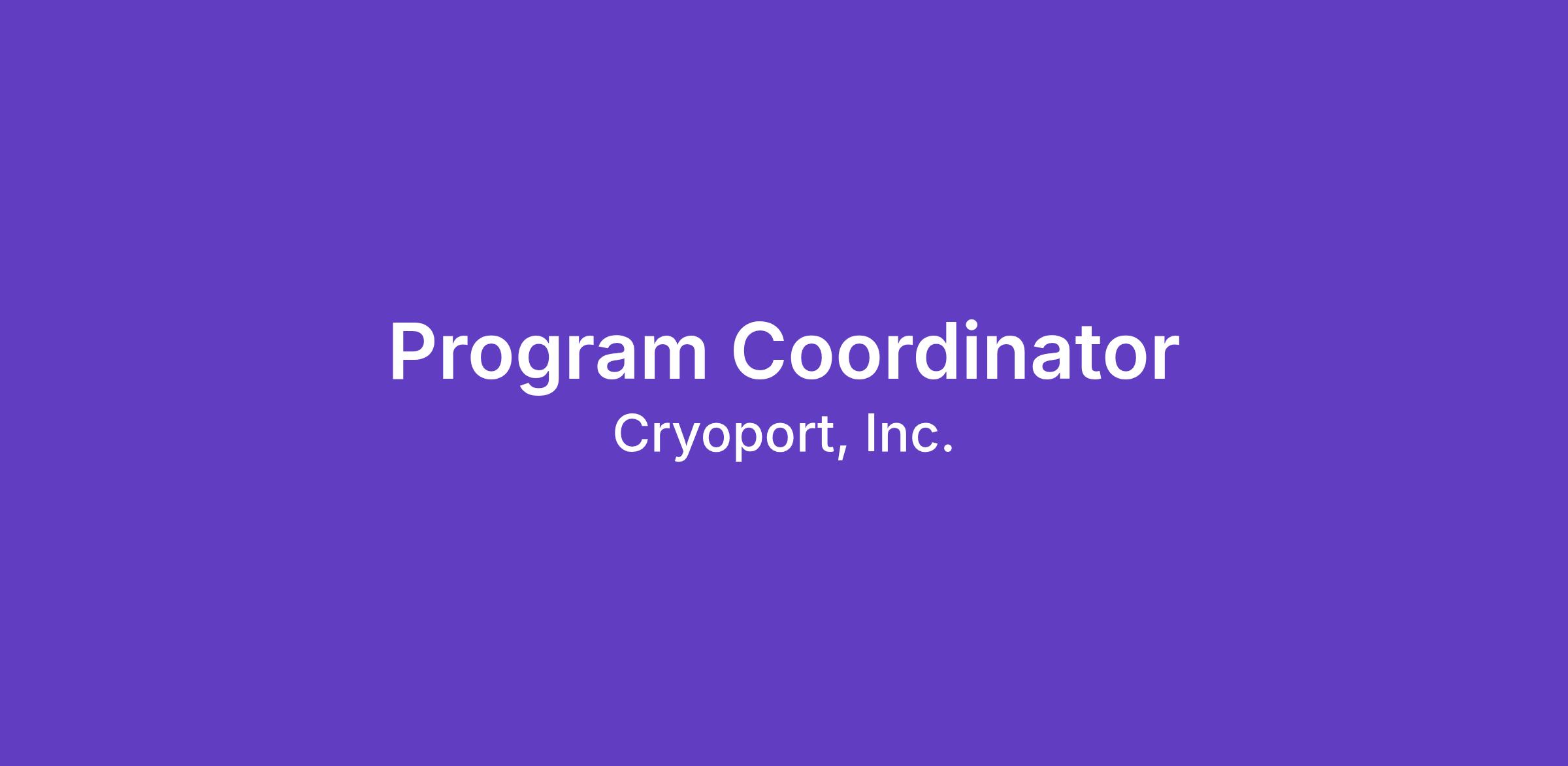 Cryoport is seeking a Program Coordinator to join the Program Management team. The coordinator will support the PMs to collaborate and coordinate internal teams to meet client expectations as well as company goals. This role is critical in anticipating and mitigating risks to ensure programs are flawlessly implemented and executed and succeed on all 3 constraints (scope, budget, and schedule). The successful candidate will be part of cross-functional teams to provide administrative support in managing new and existing client programs. The successful candidate can pivot quickly, is comfortable in navigating ambiguity and has incredible attention to detail.
