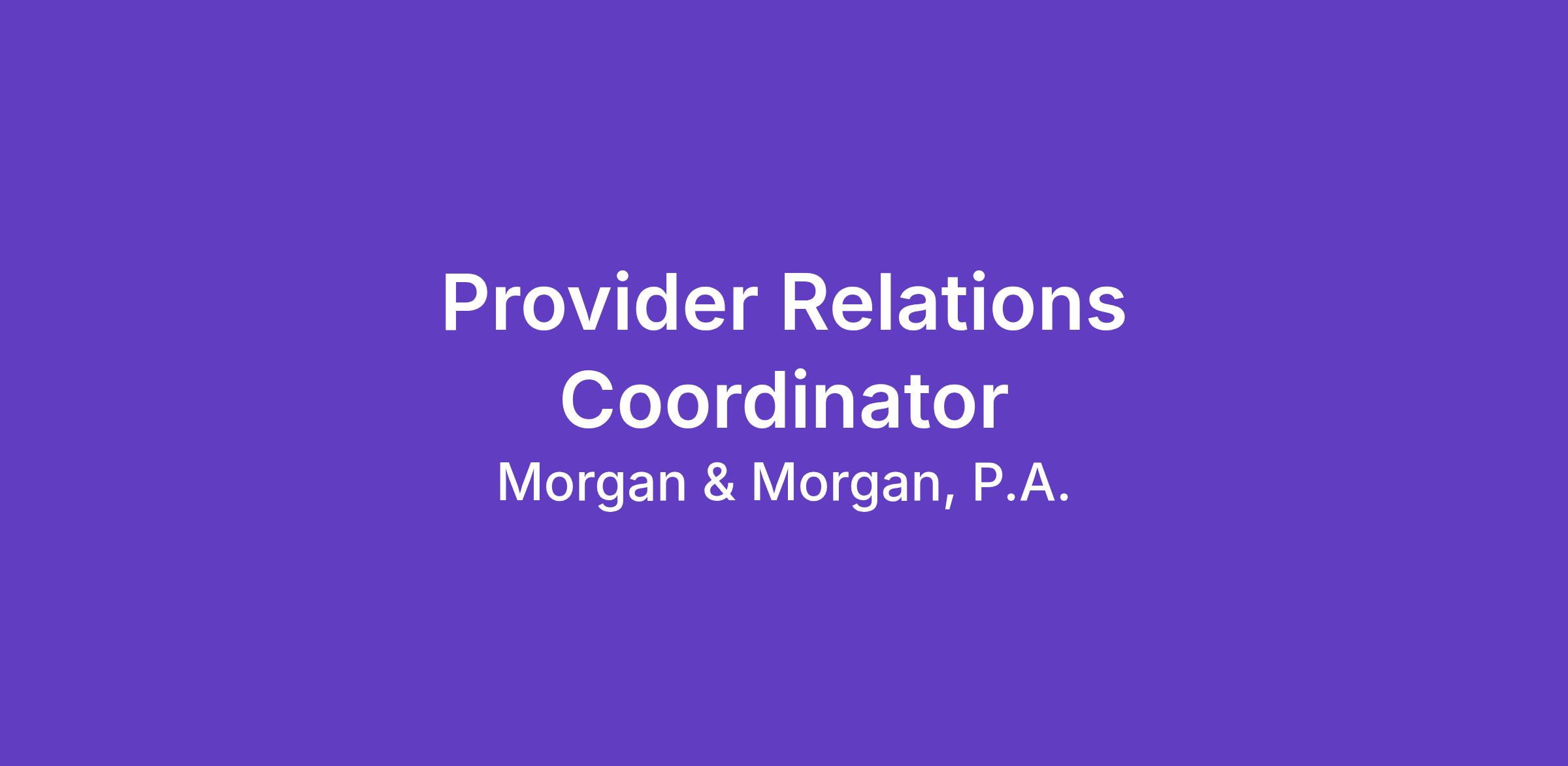 Morgan & Morgan is seeking a Provider Relations Coordinator who is responsible for developing, maintaining, and servicing high quality, marketable and satisfied provider network within an assigned geographic area. This individual will act as a primary resource for designated providers and groups to establish and maintain positive relationships by assisting with/or responding to complex issues as it relates to our clients’ requirements and lien resolutions. The Provider Relations Coordinator serves as the point of contact between multiple medical providers and Morgan and Morgan. This position is expected to build and sustain strong working relationships with cross functional departments and assigned long term care and healthcare providers.