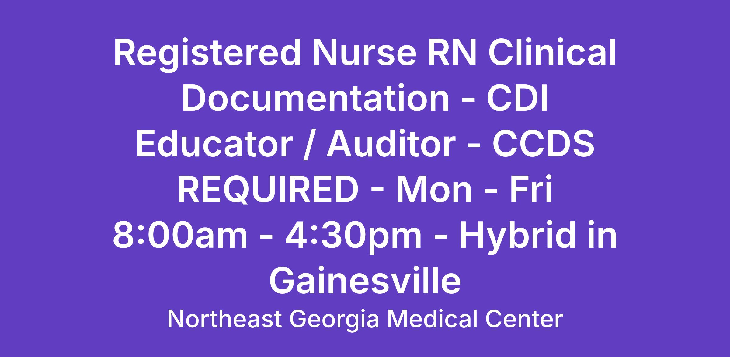 Licensure or other certifications: Current Registered Nurse license in State of GA. Certification required - Clinical Documentation Specialist (CCDS).