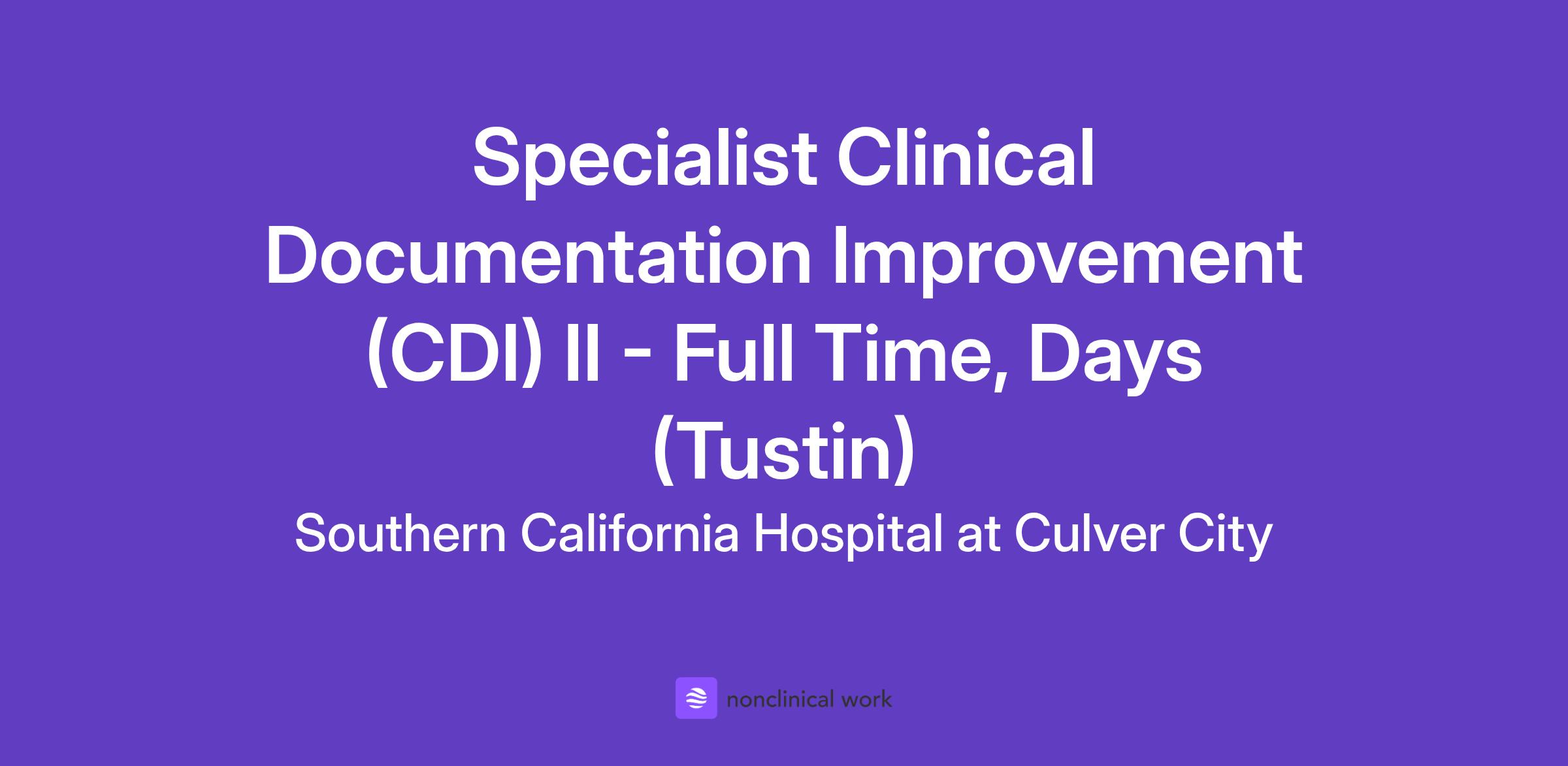DescriptionThe CDI Specialist Level II is responsible for conducting clinically based concurrent and retrospective reviews of inpatient medical records to evaluate if clinical documentation is reflective of medical necessity, quality of care outcomes and reimbursement compliance for acute care services provided. Works closely with the medical staff to facilitate appropriate clinical documentation of patient care. Other responsibilities include conducting initial and extended-stay concurrent reviews on all selected admissions and documenting findings.