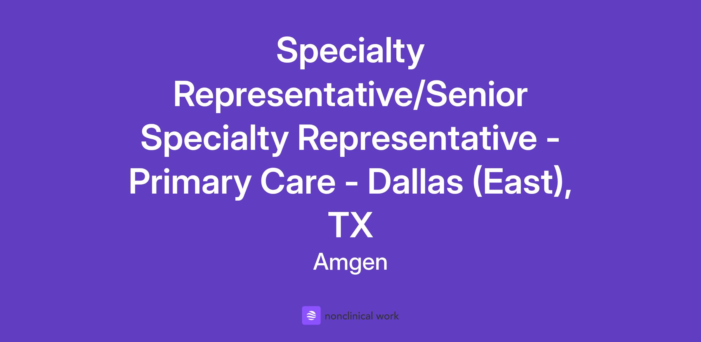 Career Category Sales Job Description Territory covers: Plano, TX; Dallas, TX; Tyler, TX Relocation is not offered for this role. Join Amgen’s Mission of Serving Patients At Amgen, if you feel like you’re part of something bigger, it’s because you are. Our shared mission—to serve patients living with serious illnesses—drives all that we do. Since 1980, we’ve helped pioneer the world of biotech in our fight against the world’s toughest diseases. With our focus on four therapeutic areas –Oncology, Inflammation, General Medicine, and Rare Disease– we reach millions of patients each year. As a member of the Amgen team, you’ll help make a lasting impact on the lives of patients as we research, manufacture, and deliver innovative medicines to help people live longer, fuller happier lives. Our award-winning culture is collaborative, innovative, and science based. If you have a passion for challenges and the opportunities that lay within them, you’ll thrive as part of the Amgen team. Join us and transform the lives of patients while transforming your career. SPECIALTY REPRESENTATIVE/SENIOR SPECIALTY REPRESENTATIVE Live What you will do Let’s do this! Let’s change the world! In this vital role you will be the connection to our customers by providing clinical knowledge of our products to medical professionals and helping them navigate the complex payer environment. We are actively searching for a Specialty Representative or Senior Specialty Representative to deliver on our commitment to serve patients. The Specialty Representative/Senior Specialty Representative acts as the primary customer contact and is responsible for implementing marketing strategy and promoting Amgen products as led by the District Manager. Responsibilities include: Provide current and comprehensive knowledge of Amgen's products and effectively communicate the clinical benefits to medical professionals to drive appropriate utilization of the products Perform as a sales leader to achieve territory sales by delivering branded sales messages, conducting planned programs, scheduling and following-up with medical educational programs, and achieving or exceeding sales targets through both in-person and virtual engagement Develop relationships to service and manage accounts which may include: customizing discussions and customer interactions based on understanding of customer needs, ensuring product access, resolving/triage reimbursement issues, and maintaining product contracts Provide feedback on marketing strategy, analyze business effectiveness of sales activities and territory analysis, and develop territory plans with the District Manager Partner with other colleagues to share best practices and seek to learn and grow as a Specialty Representative/Senior Specialty Representative Demonstrate passion for our products and sustain that passion through the entire sales cycle while always building our brand and never losing sight of how we serve patients Uphold Amgen Values: Be Science-Based; Compete Intensely and Win; Create Value for Patients, Staff, and Stockholders; Be Ethical; Trust and Respect Each Other; Ensure Quality; Work in Teams; Collaborate, Communicate, and Be Accountable Win What we expect of you We are all different, yet we all use our unique contributions to serve patients. The sales professional we seek is a motivated individual with these qualifications. Basic Qualifications (Specialty Representative): Bachelor's Degree OR Associate's degree and 4 years of Sales experience OR High school diploma/GED and 6 years of Sales experience Basic Qualifications (Senior Specialty Representative): Bachelor’s degree and 3 years of sales experience and/or clinical experience in healthcare / scientific field that is not sales related OR Associate degree and 6 years of sales experience and/or clinical experience in healthcare / scientific field that is not sales related OR High school diploma / GED and 8 years of sales experience and/or clinical experience in healthcare / scientific field that is not sales related Preferred Qualifications: 1–3 years of sales, marketing, or clinical experience (pharmaceutical or healthcare industry preferred) Product or hospital sales experience in the areas of oncology, cardiology, inflammation, nephrology, dermatology, rheumatology, neurology, endocrinology, hepatology, gastroenterology, bone health, respiratory, hematology, or infectious diseases; and the diseases and treatments involved with these specialties Some experience and/or pre-graduate sales or leadership training, or a demonstrated track record of success under pressure A hunter’s mindset — hungry, ambitious, and driven to exceed goals Strong communication, storytelling, and persuasion skills with the ability to influence diverse audiences Genuine passion for sales, relationship-building, and improving patient outcomes Curiosity and learning agility — eager to absorb product knowledge and industry insights quickly Resilience and adaptability — thrives in a fast-paced, competitive environment Entrepreneurial spirit — proactive, self-motivated, and resourceful in finding creative ways to win business Desire to build a long-term career in pharmaceutical sales, with a focus on the cardiovascular therapeutic area Demonstrated integrity, professionalism, and accountability in all interactions Bachelor's degree in Life Sciences or Business Administration Adaptability with our Core Competencies: Sales Planning and Organizing; Leveraging Business, Industry, and Technical Knowledge; Communicating with Impact; Driving for Results; and Cultivating Internal and External Relationships. Local Market knowledge This position is open to candidates of various backgrounds and experience levels. The role level/title will be chosen based on the candidate’s match to basic qualifications and level of experience required for this geography. Thrive What you can expect of us As we work to develop treatments that take c