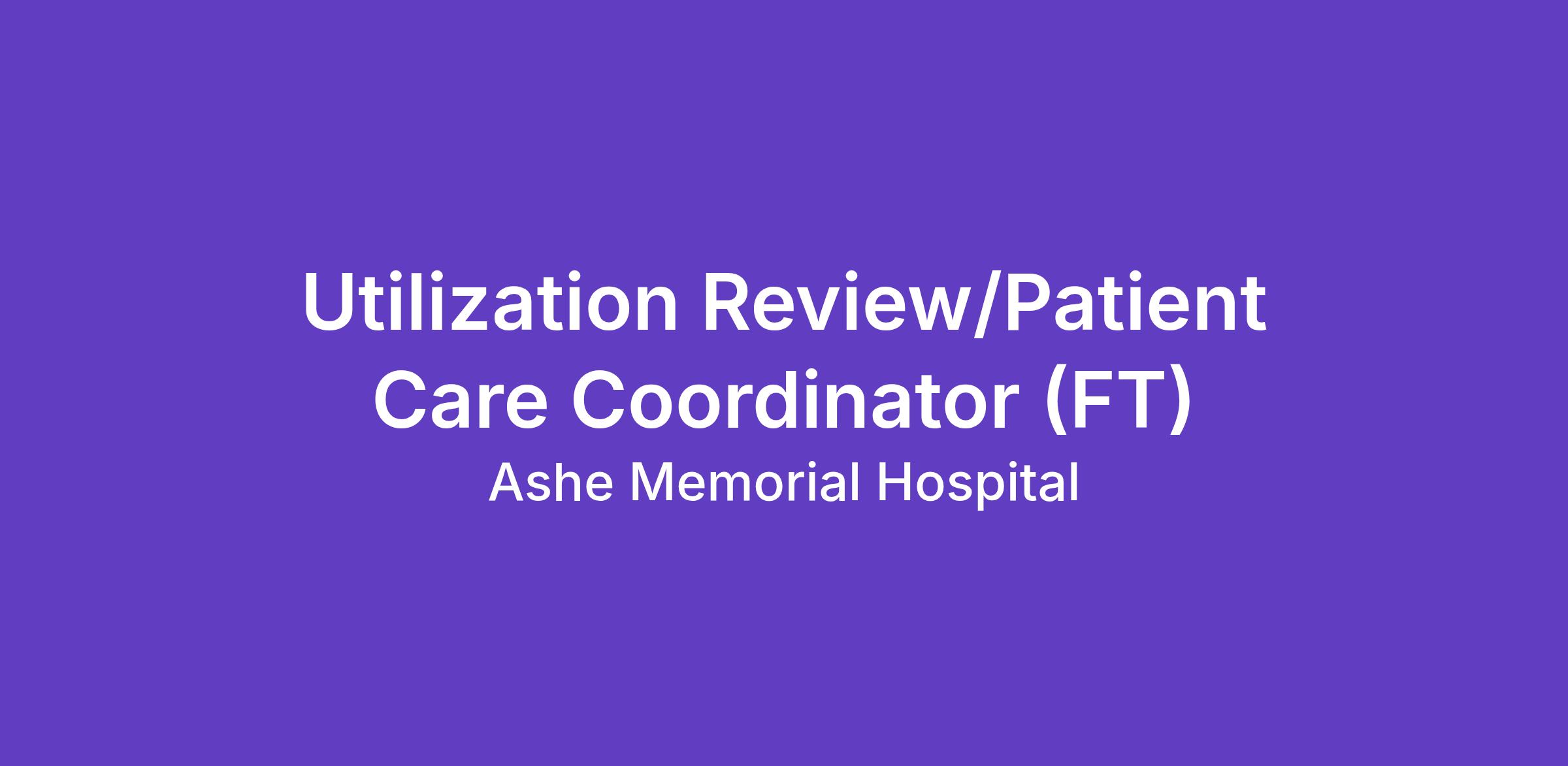 Utilization Review/Patient Care Coordinator (UR/PCC) is responsible for the coordination and management of the Ashe Memorial Transitional Care Services program, also known as Swing Bed. This includes managing the referral process, both internal and external, as well as marketing and outreach to other facilities. The UR/PCC is also responsible for all Utilization Review activities within Ashe Memorial Hospital. This individual will be responsible to ensure that both the TCS program and Utilization Review meets all regulatory compliance from accrediting agencies. Performs all work with accordance to the mission, vision and values of Ashe Memorial Hospital (AMH).